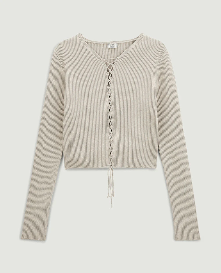 – Top beige en maille côtelée.