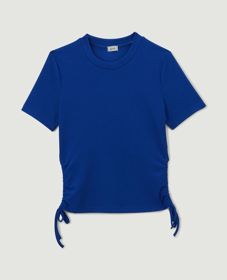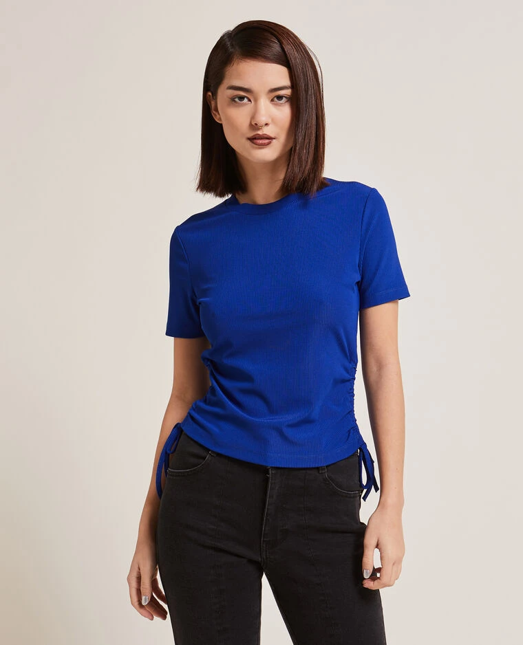 – Top bleu indigo en maille côtelée.