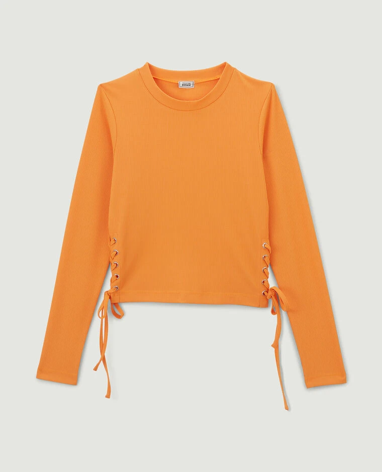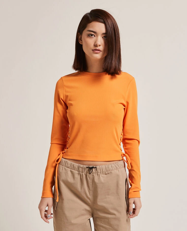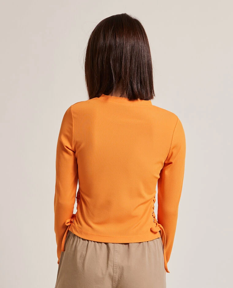 – Top orange en maille côtelée.