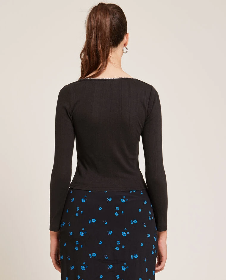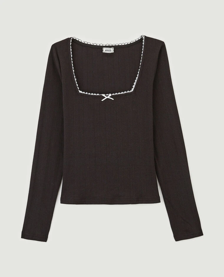 – Encolure carrée avec biais micro-crochet blanc et noir + nœud en tissu satiné blanc.