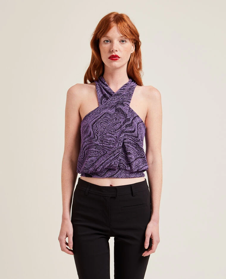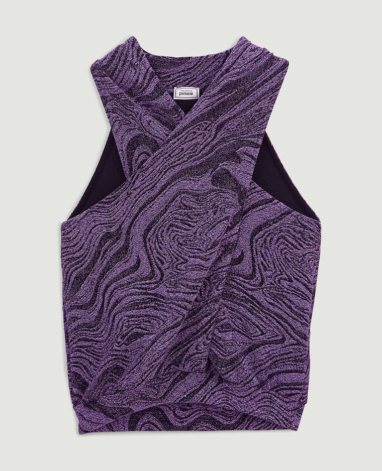 – Top sans manche en maille lurex violette et aubergine.