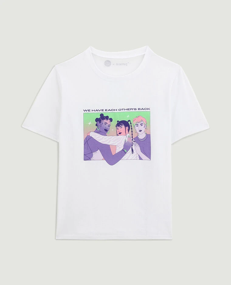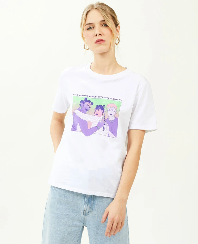 – T-shirt manches courtes blanc avec graphisme devant + inscription WE HAVE EACH OTHER’S BACK.